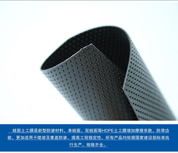 糙面HDPE土工膜具有优异的温度适应性,可焊接性,耐候性和良好的抗老化性、耐化学腐蚀性、耐环境应力开裂性能及抗戳穿性能。